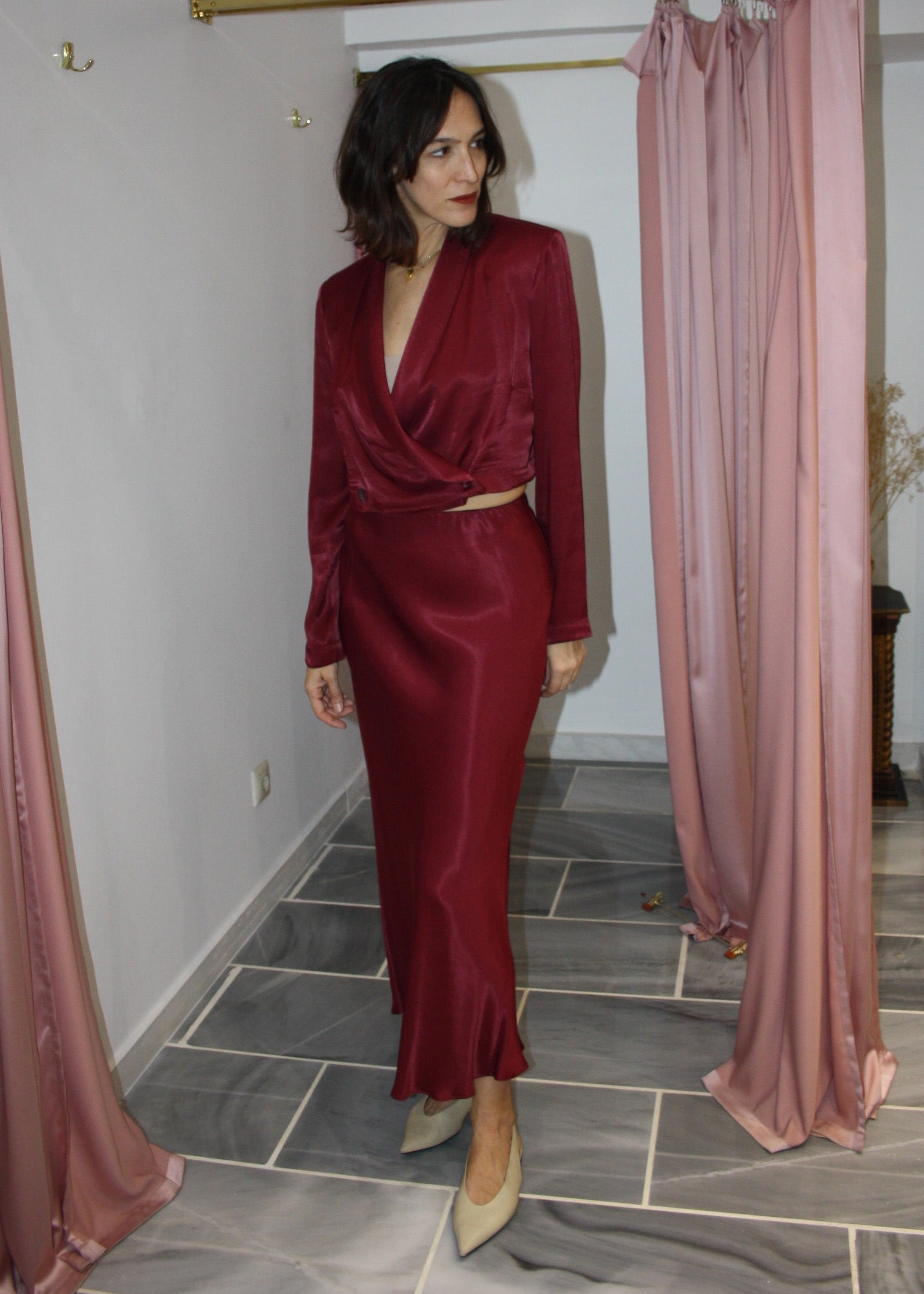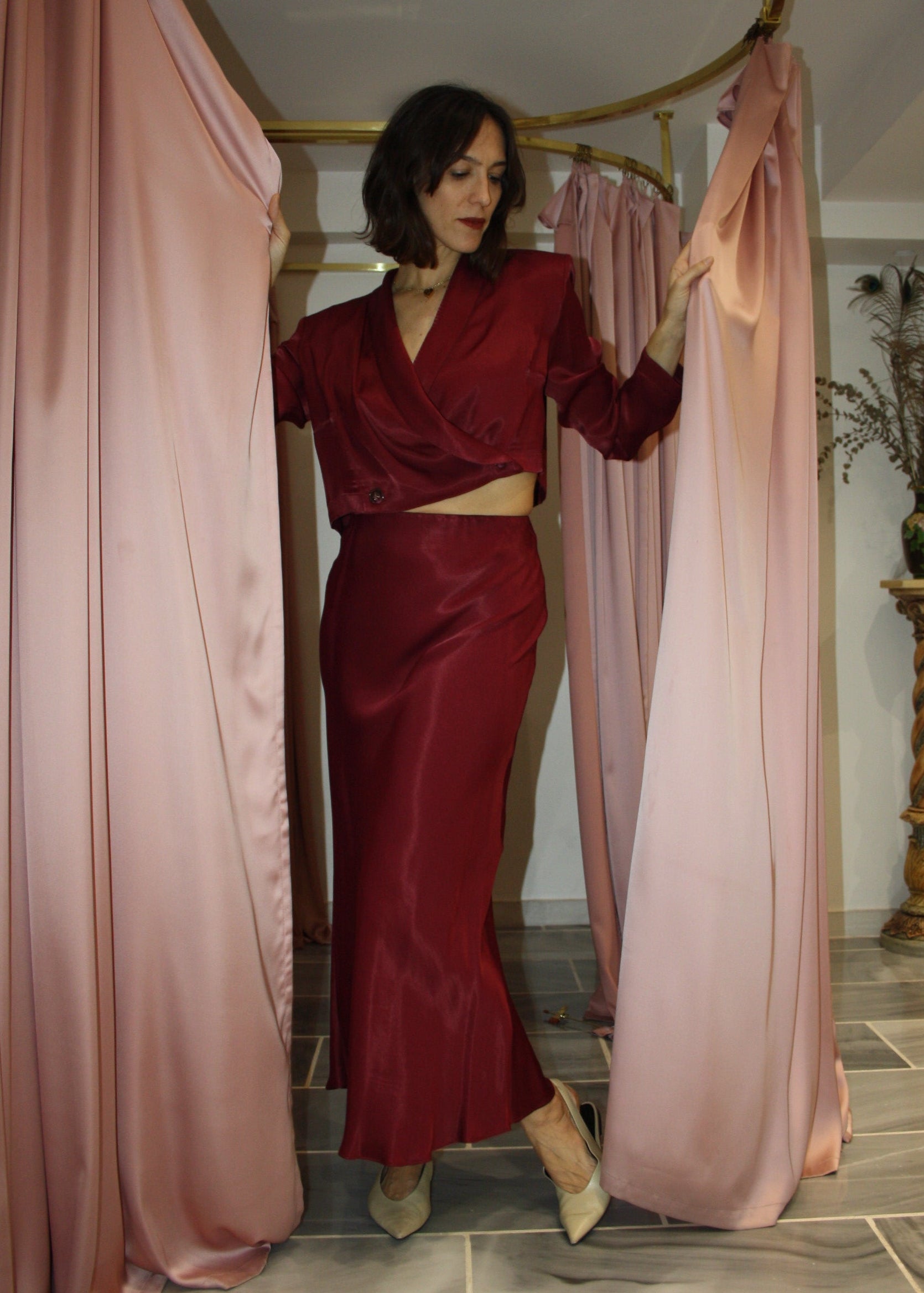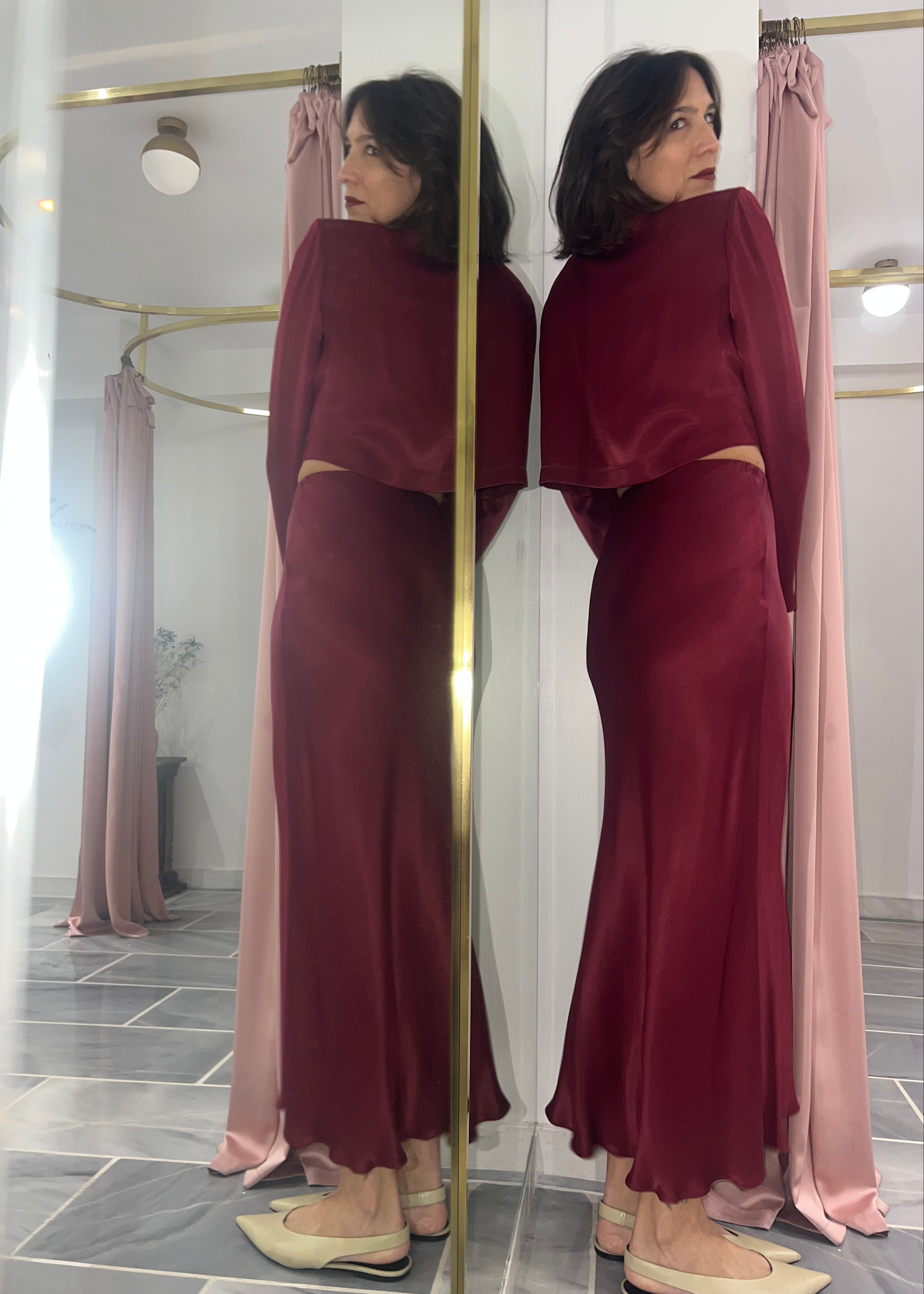 This skirt is cut on the bias from silky viscose that drapes elegantly over your frame and falls to a midi length. Pair it with its matching Cropped Blazer from the collection to create a total outfit.
